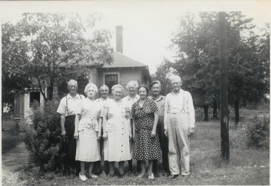 Source & Description: This picture is of 4 of the 5 children (and their spouses )of George and Matilda Alzina (Smith) Atchey of Quincy, Adams Co., Wisconsin. This is probably taken in the 1930s. Left to right (back row): Louis Atchey, John Vogt, and Grace (Atchey) Wehner; front row: Helen (Linkowski) Atchey (Louis' wife), Laura (Atchey) Vogt, Emma (Tanger) Atchey (George's wife), and George Henry Atchey. I believe this picture was taken in Adams Co. Contributed by Shannon W.