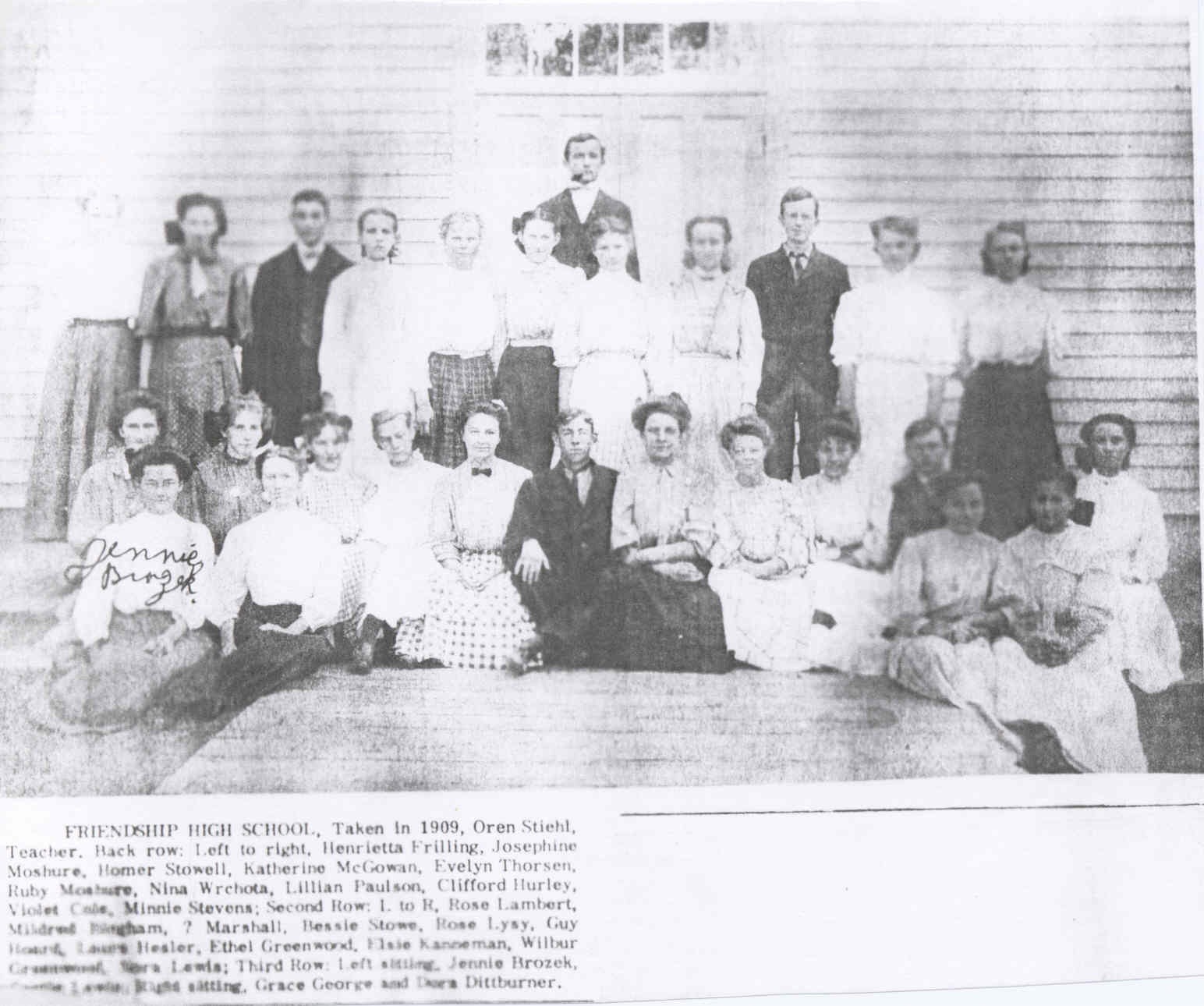 Source & Description: Contributed by Sally Traver from her husband's grandmother's (Ethel Viola Burr) scrapbook from an unknown newspaper, possibly the Adams/Friendship newspaper, of the Friendship High School Class of 1909. Those identified in the photo: Teacher Oren Stiehl, Henrietta Frilling, Josephine Moshure, Homer Stowell, Katherine McGowan, Evelyn Thorsen, Ruby Moshure, Nina Wrchota, Lillian Paulson, Clifford Hurley, Violet Cole, Minnie Stevens, Rose Lambert, Mildred Bingham, ? Marshall, Bessie Stowe, Rose Lysy or Lyay, Guy Howard, Laura Hesler, Ethel Greenwood, Elsie Kanneman, Wilbur Greenwood, Nora Lewis, Jennie Brozek, ? Levin, Grace George and Laura or Dora Dittburner.