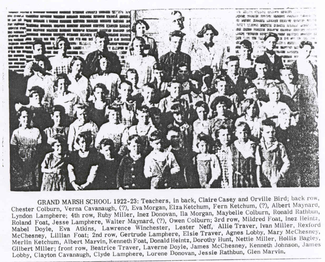 Others identified in the picture are: Claire CASEY, Orville BIRD, Chester COLBURN, Verna CAVANAUGH, Eva MORGAN, Eliza KETCHUM, Fern KETCHUM, Albert MAYNARD, Lyndon LAMPHERE, Ruby MILLER, Inez DONOVAN, Ila MORGAN, Maybelle COLBURN, Ronald RATHBUN, Roland FOAT, Jesse LAMPHERE, Walter MAYNARD, Owen COLBURN, Mildred FOAT, Inez HEINTZ, Mabel DOYLE, Eva ATKINS, Lawrence WINCHESTER, Lester NEFF, Allie TRAVER, Ivan MILLER, Rexford McCHESNEY, Lillian FOAT, Gertrude LAMPHERE, Elsie TRAVER, Agnes LOBBY, Mary McCHESNEY, Merlin KETCHUM, Albert MARVIN, Kenneth FOAT, Donald HEINTZ, Dorothy HUNT, Nettie MILLER, Hollis BAGLEY, Gilbert MILLER, Beatrice TRAVER, Laverne DOYLE, James McCHESNEY, Kenneth JOHNSON, James LOBBY, Clayton CAVANAUGH, Clyde LAMPHERE, Lorene DONOVAN, Jessie RATHBUN, Glen MARVIN.
