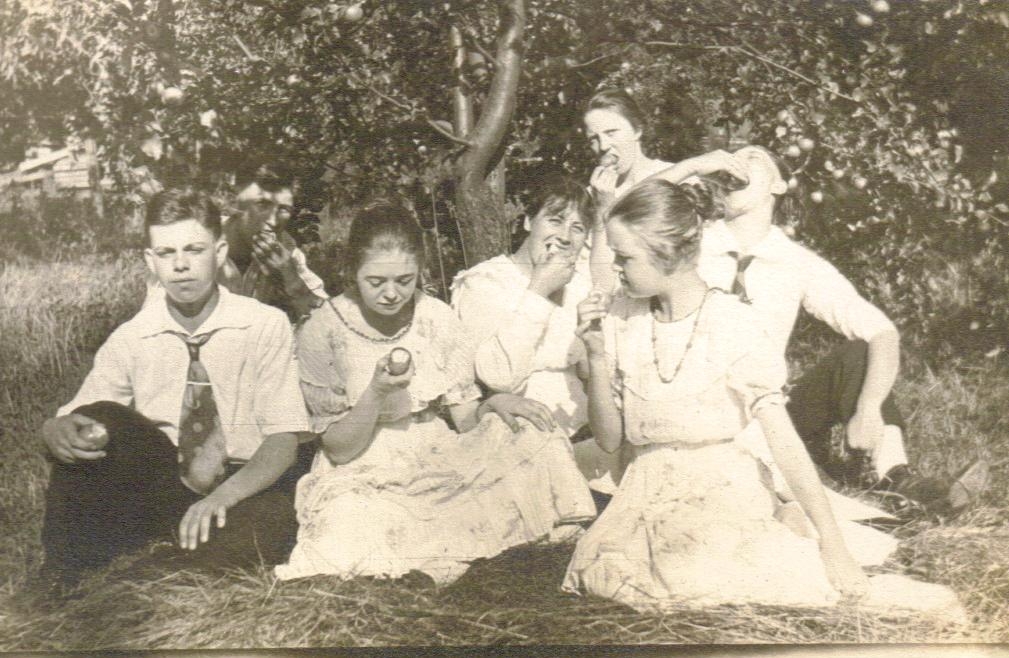 Parasol Girls 1 and Parasol Girls 2 Source & Description: Mark (Niles) Newstrom sent pictures of Parasol Girls 01 and Parasol Girls 02, taken around 1916, apparently near a family fruit orchard (apples?) which makes me think Adams County. In picture 01, my grandfather RB Niles is third from left. In picture 02 he is clowning on the far right.