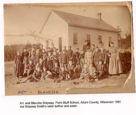 Contributed by PJ Burnsky, the photo identifies Art and Blanche Shipway. (their heads are circled) Regarding the Point Bluff School photo (circa 1891) here are names of most of the people in the photo. Unfortunately, I do not know the corresponding positions with the names. Presented here is the list of names in the order written on the photo. some are missing for there are 36 people in the photo and only 21 names on the photo. D. Cummings, E. Gahan, Dottie Cummings, D. Averchouser, Geo Gahan, Yertie C., M. Evans, Bertha Bonnell, Sam Zentner, Two Maxeys, May Douglas, Blanche Shipway (circled), Maud Evans, Rudy Colbin, Lillie Douglas, Bert C., John Zentner, Two Maxeys, Geo Schuff (Schoff?), Lola Hamilton, Will Z., Sam C., Will Brinner, Louis Bonnell, Art C., Art Shipway ( Circled), Ralph Schuff, Leo Gahan and A. Ketchum.