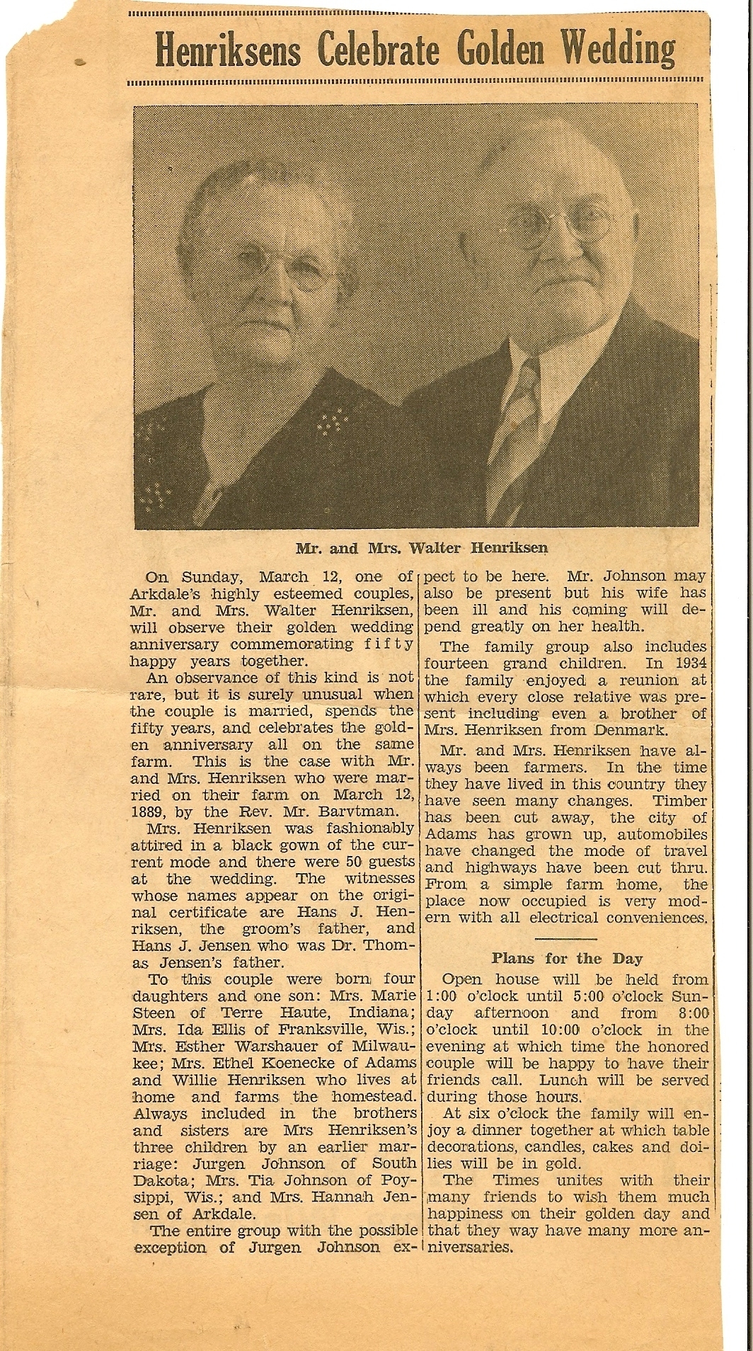 She was married to Jorgen P. Johansen first. They had 3 children: Jorgen Johnson, Hannah (JENSEN) and Matea (Thea JOHNSON). After Jorgen's death, she married my great-great grandfather Walter Henriksen (1865-1954). (see 50th anniversary article) They had 5 children: William (buried in East Arkdale Cemetery with his wife Clara nee Swenson; (my great-grandparents), Marie (Steen; buried in Racine County, WI), Ida (Ellis; buried in Forest Lawn Cemetery, Racine Co, WI); Ethel (Koenecke; buried in Adams County?), Esther (Warshaeur; unknown burial place at this time).